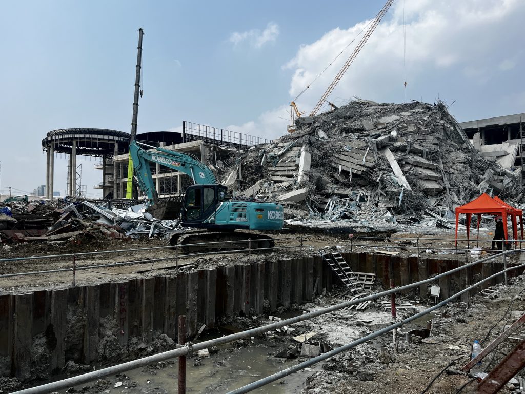The photographs document that evening and the following day at the collapse site, where rescue operations continued as authorities worked to free more than one hundred people still trapped under the debris.